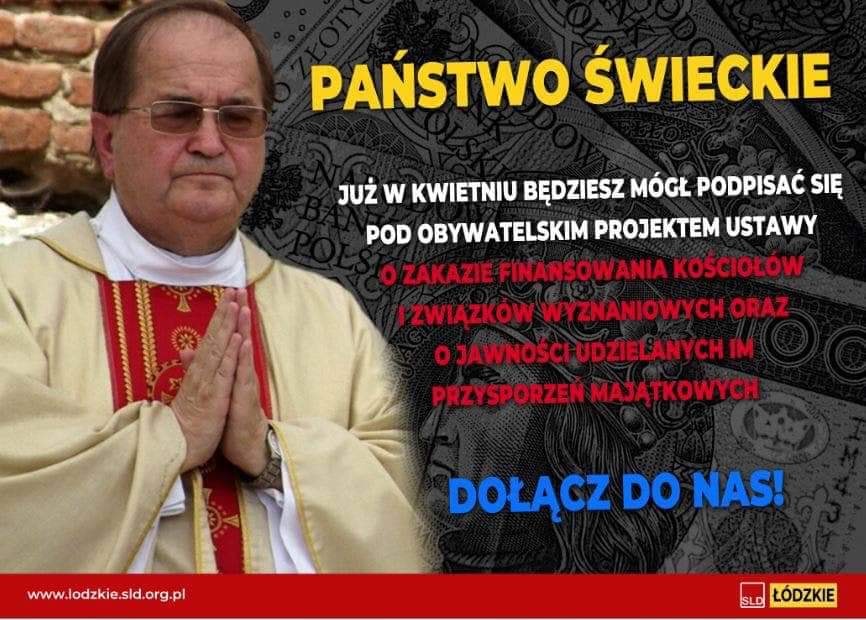 Na wiosnę działacze i politycy lewicy, w tym Sojuszu Lewicy Demokratycznej, rozpoczną zbiórkę podpisów pod obywatelskim projektem ustawy, zakazującej finansowania kościołów i związków wyznaniowych z pieniędzy publicznych. To jeden z elementów państwa świeckiego i realizacja konstytucyjnej zasady rozdziału Kościoła od państwa.